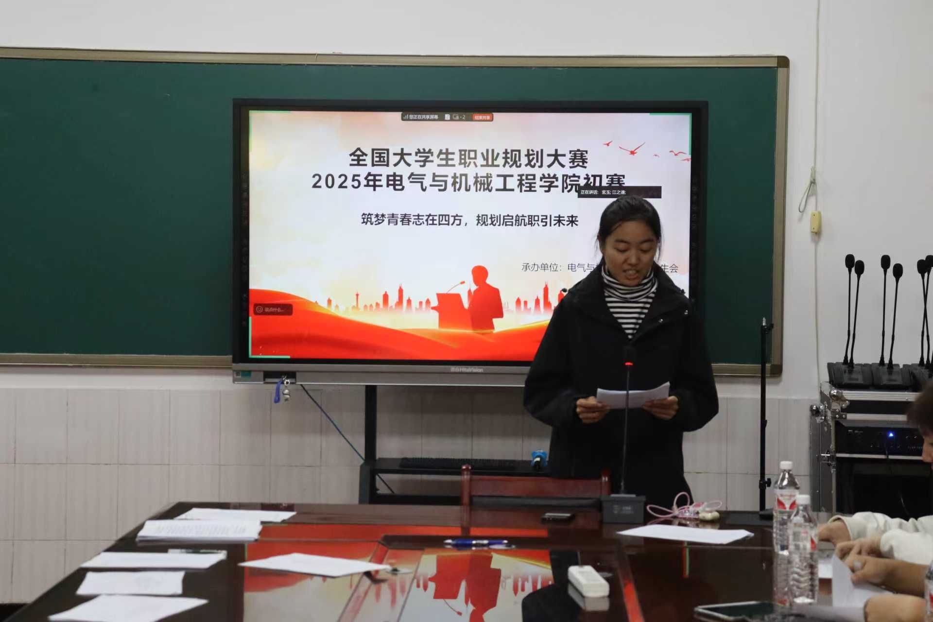 为贯彻落实我校关于毕业生就业工作的决策部署,加强职业发展教育和就业指导,促进毕业生高质量充分就业,10月29日晚,我院于3314会议室成功举办大学生职业规划大赛学院初赛。赛事采用线上线下同步直播形式进行,专任教师彭信杰,辅导员高文俊、张翘楚、周全之、茹菲菲担任评委,学生代表及全体参赛选手现场参与,2025级全体学生在教室实时收看直播。