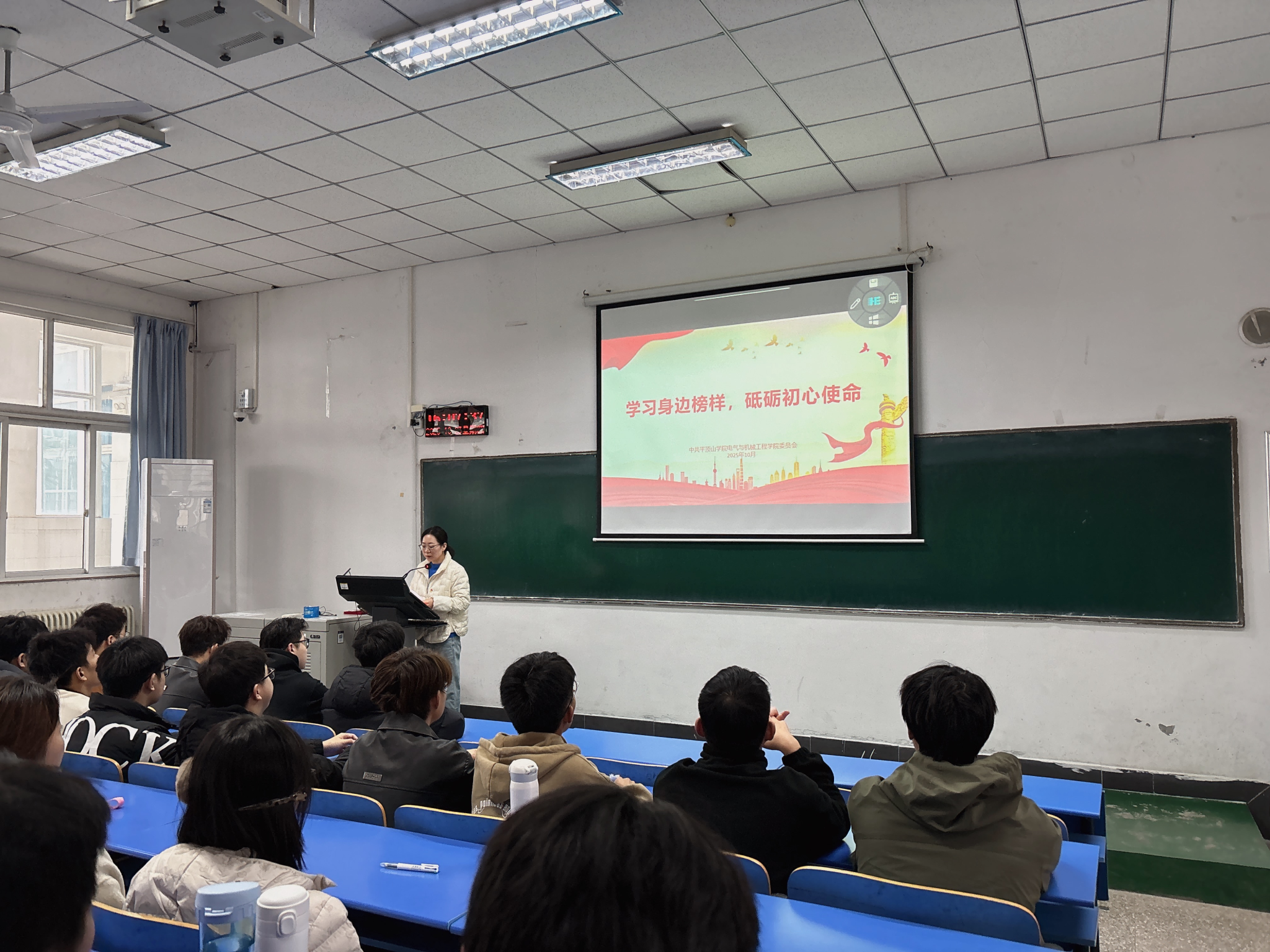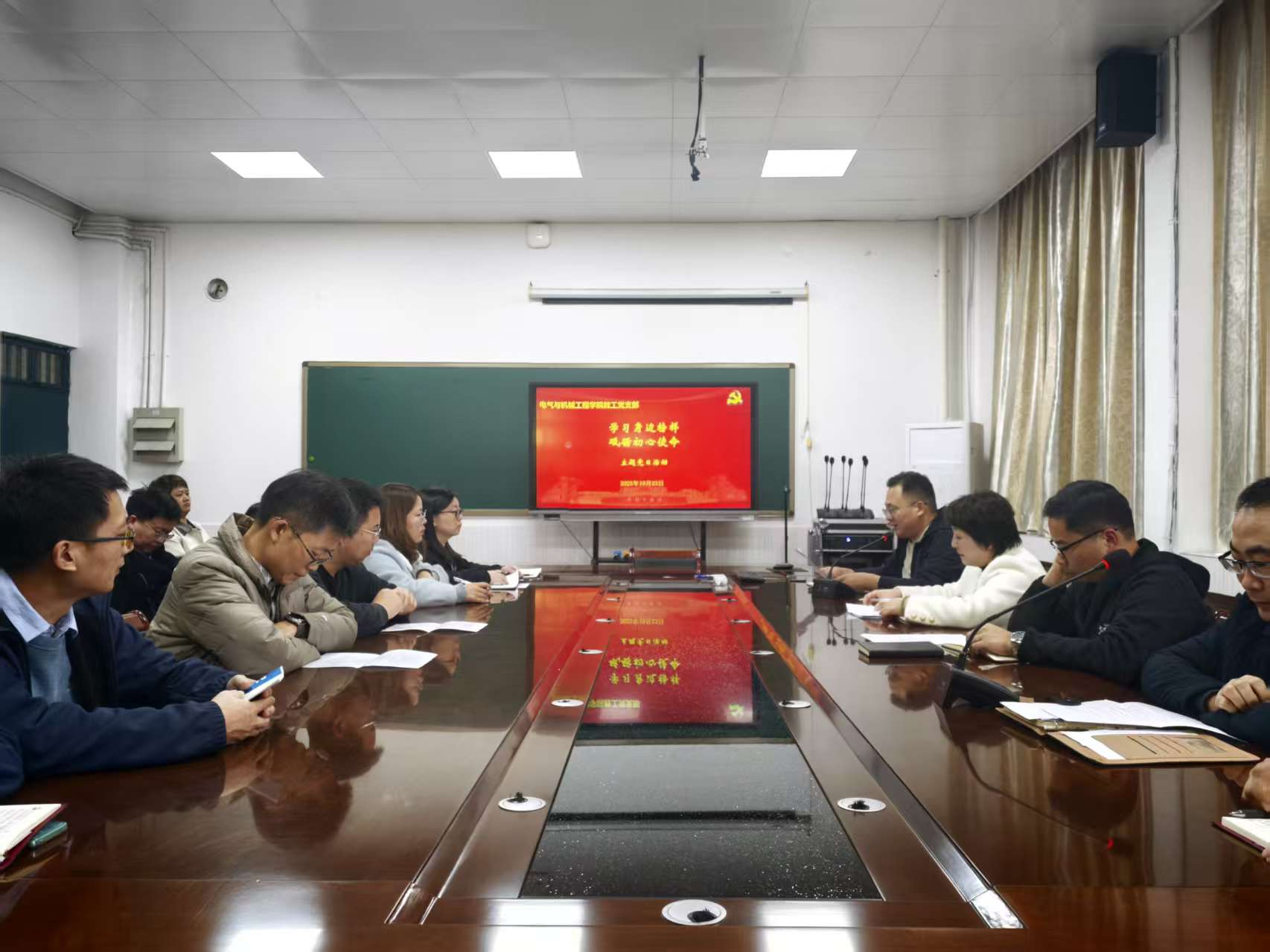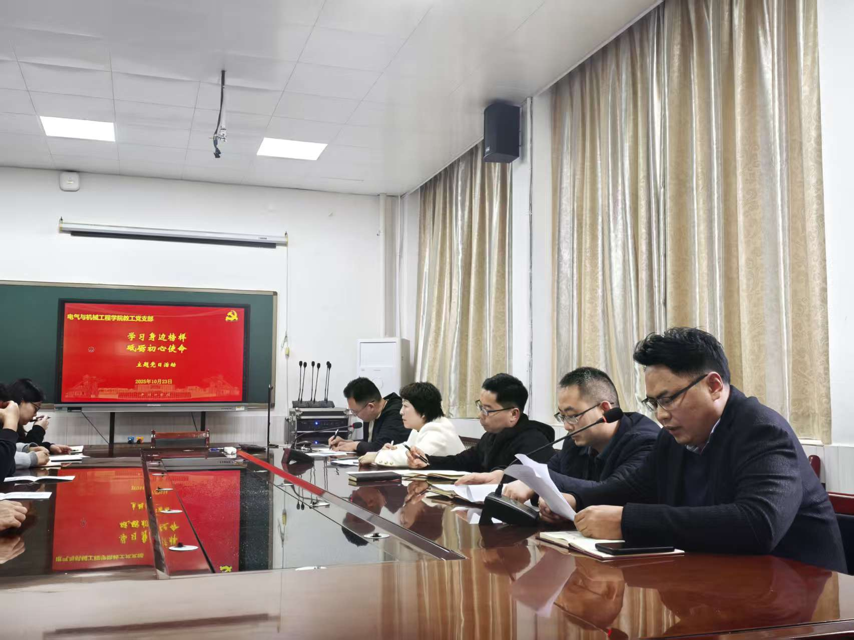 2025年10月,电气与机械工程学院2023级电气工程及其自动化专业学生孔泽成拾金不昧先进事迹受到社会广泛好评。为充分发挥先进典型的示范引领作用,激励广大师生党员见贤思齐、担当作为,营造崇尚先进、学习先进、争当先进的浓厚氛围,10月23日下午,电气与机械工程学院教工党支部和学生党支部分别召开了“学习身边榜样,砥砺初心使命”主题党日活动。