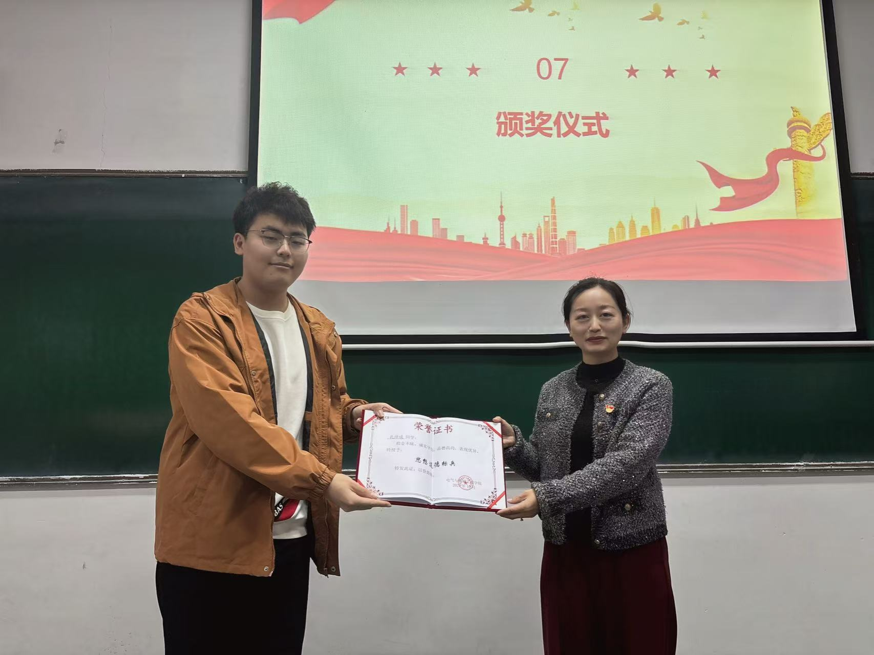 祁坤代表学院党委为孔泽成颁发了“思想道德标兵”荣誉证书,高度肯定了其拾金不昧事迹的示范意义。她指出,孔泽成同学的善举不是偶然,而是长期修养与品性锤炼的必然结果,是学校思政教育成果的生动体现。祁坤对全体党员提出三点希望:第一,要把“学习榜样”融入思想自觉,做“诚信品格”的坚守者。第二,要把“践行美德”融入行动自觉,做“道德风尚”的传播者。第三,以成长为志,做思政教育的主动践行者与正能量传播者。用诚信涵养品格,用行动传递正能量,努力成为德才兼备、堪当民族复兴大任的时代新人。